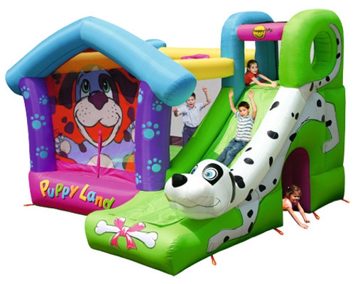 Dies ist eine große Hüpfburg mit einer langen Rutsche und
